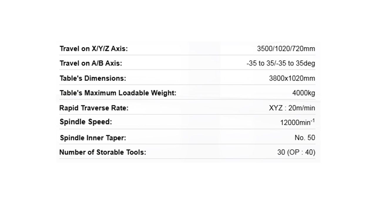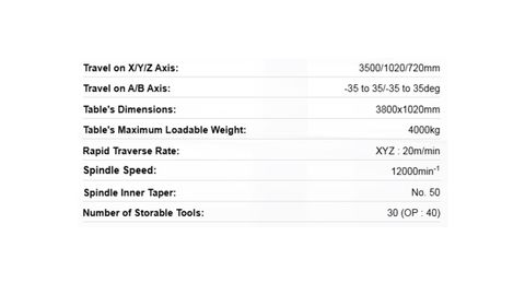 This five-axis machining unit, with the use of the spindle-tilted and swivel structure (suitable for machining large-size works), uses a long table to machine long works.