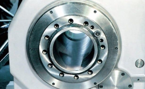 The spindle has high rigidity due to it being supported by precision bearing, and the diameter of the spindle bore is Φ104 mm, which is favorable for turning. The Φ181 mm spindle bore option is very effective for machining large diameter workpieces in the spindle.