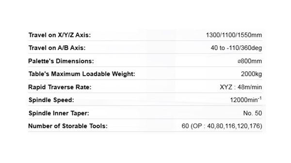 This machine adopts the large twin ball screw-based synchronous control drive system for its x- and y-axes, to suppress vibration and improve the quality of machined units. Additionally, all axes adopts the ball screw hollow cooling ball function and the ball screw thermal displacement correction function (Nidec OKK’s uniquely developed correction function) as standard, to suppress thermal displacement and improve machining accuracy.