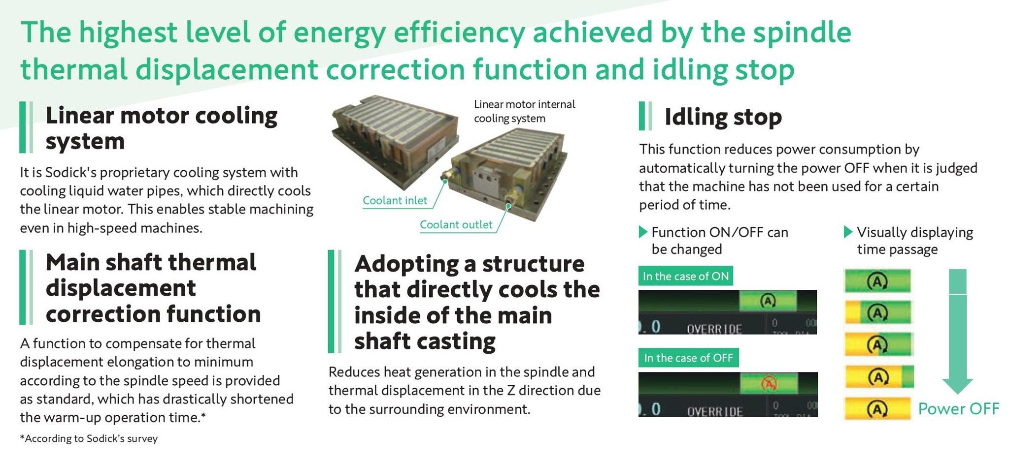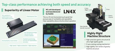 Vertical machining centers featuring linear motors developed and manufactured by Sodick on all axes. Their lineup includes Machining Centers that achieves ultra-precision machining in nano-machining, and high-precision machines that specialize in high-speed milling using high-speed rotating spindles.